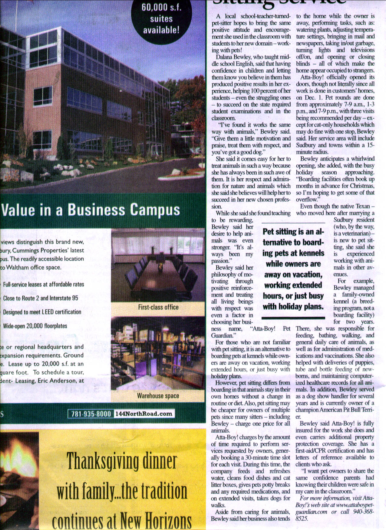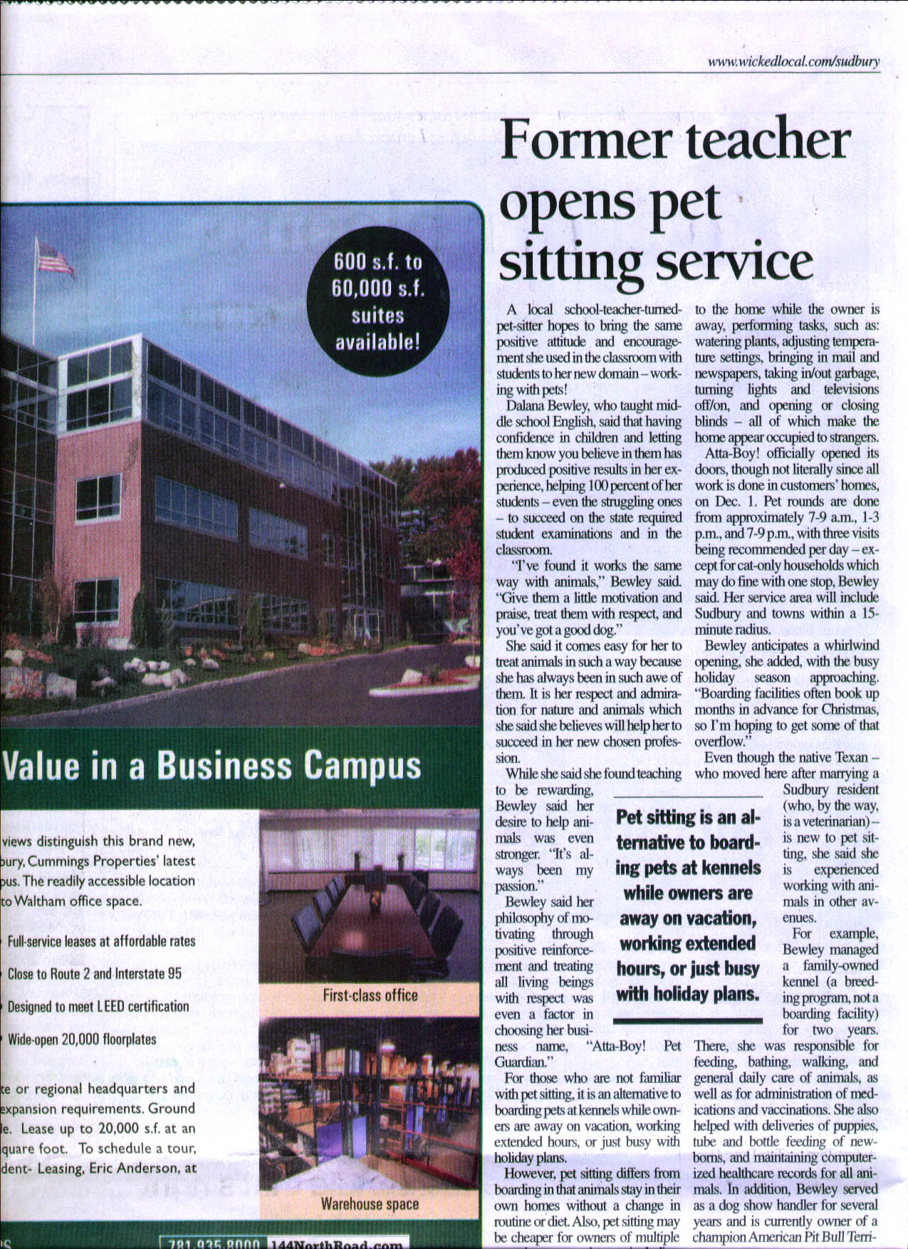 The Sudbury Town Crier featured Atta-Boy! Pet Guardian in a story published Dec. 4, 2008, page 4 of the newspaper's main section!